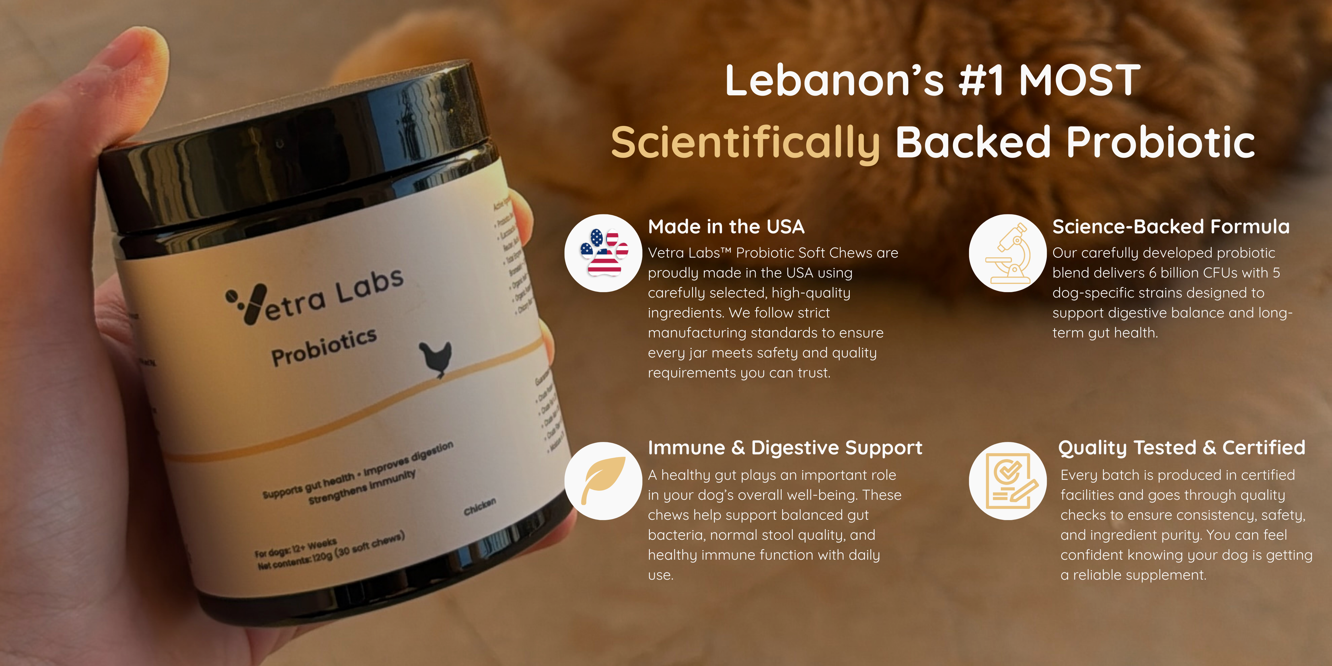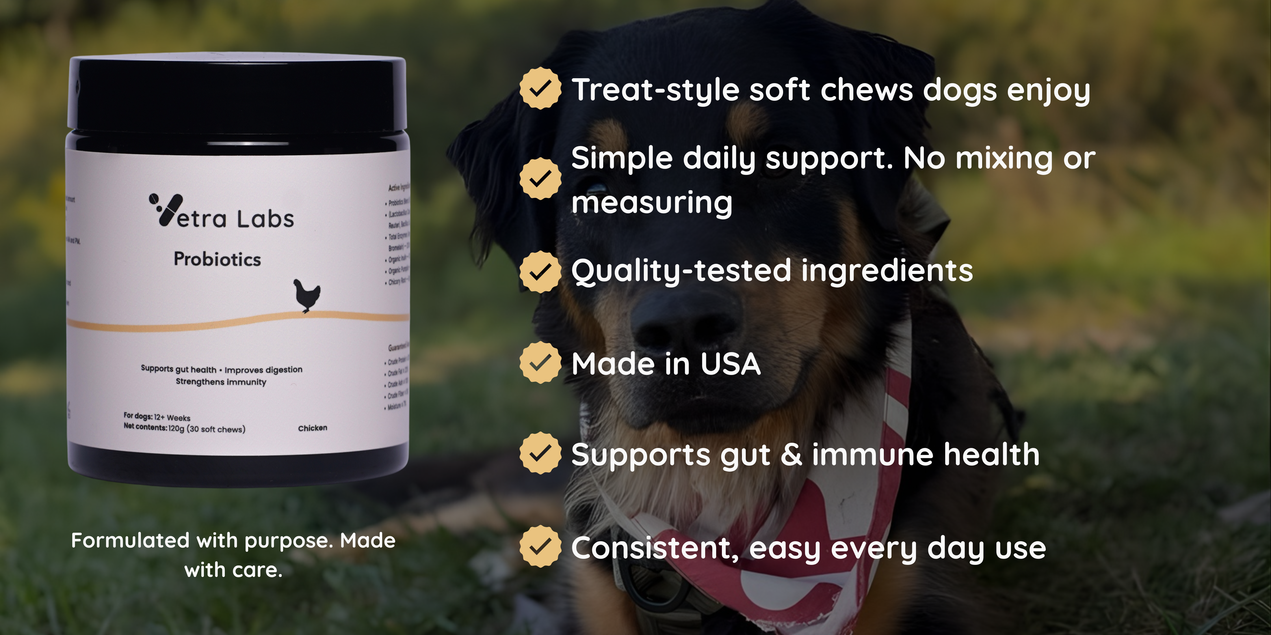 Vetra Labs Probiotics come in a soft chew form, which means no mixing, measuring, or mess. Unlike powders, the chews can be given directly and are easier for dogs to enjoy.