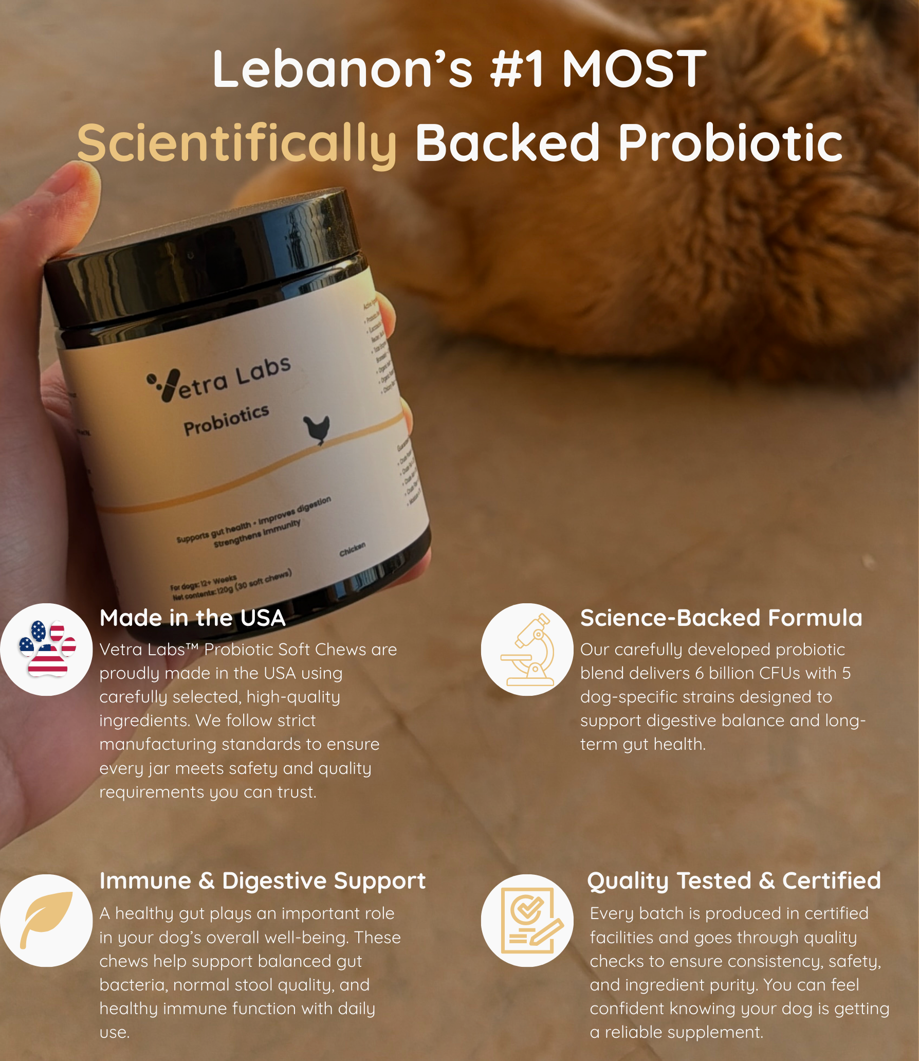 Each jar of Vetra Labs™ - Probiotic Chews contains 30 soft, treat-style chews, and Made in USA! formulated to support healthy digestion and gut balance in pets. Designed to be given daily, these chews are easy to serve and enjoyed like a treat—no mixing or measuring needed.